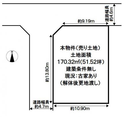 | 前面道路 | 西側約4.7m、北側約4.6m | 私道負担 | 私道負担なし |