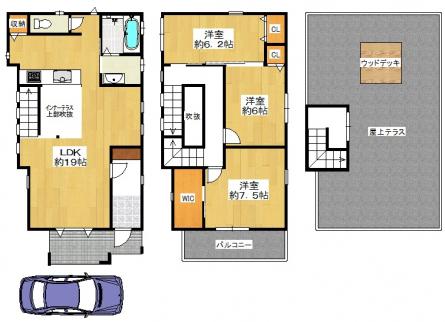 | 備考 | 〜おすすめポイント〜 ・2014年建築の2階建て、屋上にはウッドデッキ、 家庭菜園も楽しんでいただけます。 ・リビング約19帖の空間で、吹き抜け階段のモデルハウス 使用でお洒落な間取りです。 ・各洋室も6帖以上を確保、収納もございますので、 レイアウトのしやすい間取りとなっております。 ・お車以外にも自転車や、バイクなども駐車していただける 空間がございます。 ・開発された分譲地ですので、前面道路も約6mあり、 陽当り、通風共に良好です。 ・近隣には、スーパー、コンビニなど生活環境が充実。 |